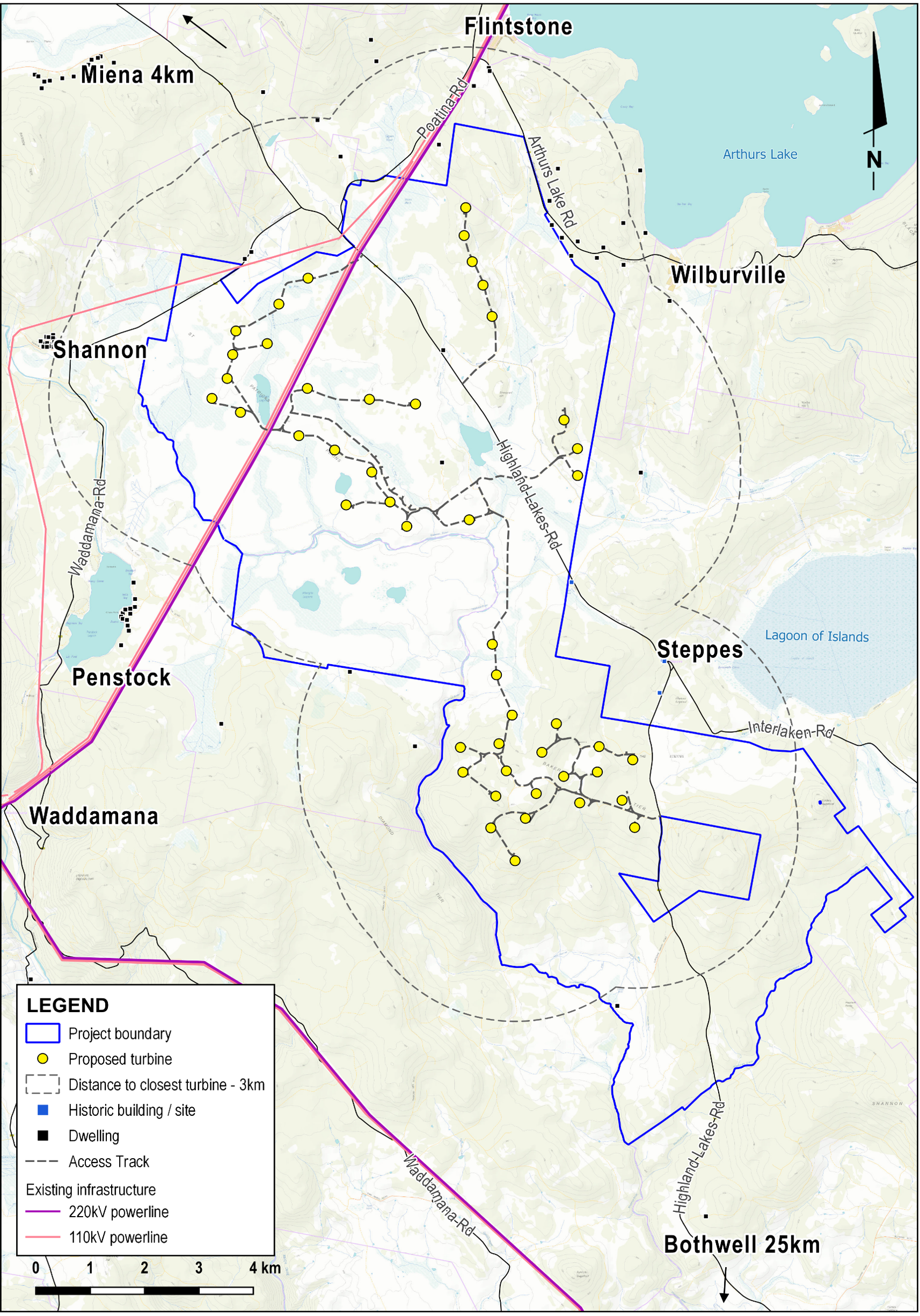 The elevated plains to the south-east of Miena in central Tasmania have strong wind speeds. The map below shows the proposed layout for the St Patricks Plains Wind Farm of 47 wind turbines and the existing 110,000 volt and 220,000 volt transmission lines.